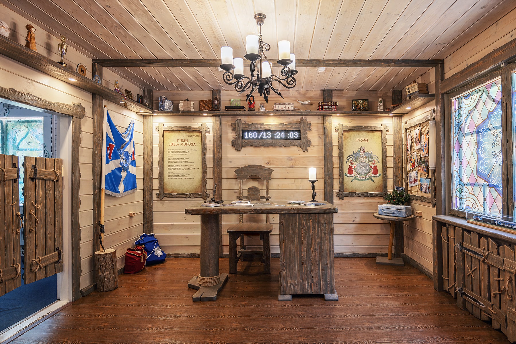 Путешествие по Терему Деда Мороза и встреча с Зимним Волшебником. Именно здесь происходит главное таинство Новогоднего праздника – общение с Дедом Морозом. В Тереме Деда Мороза, помимо Тронного зала, есть еще немало волшебных комнат, посетив которые, вы узнаете, как живется в них Деду Морозу: где он спит (спальня с резной кроватью и пуховыми перинами), в какие одежды одевается (гардеробная с удивительными сказочными нарядами), где работает (рабочий кабинет с библиотекой и обсерваторией), где хранится коллекция подарков, которые привозят Деду Морозу со всего света.